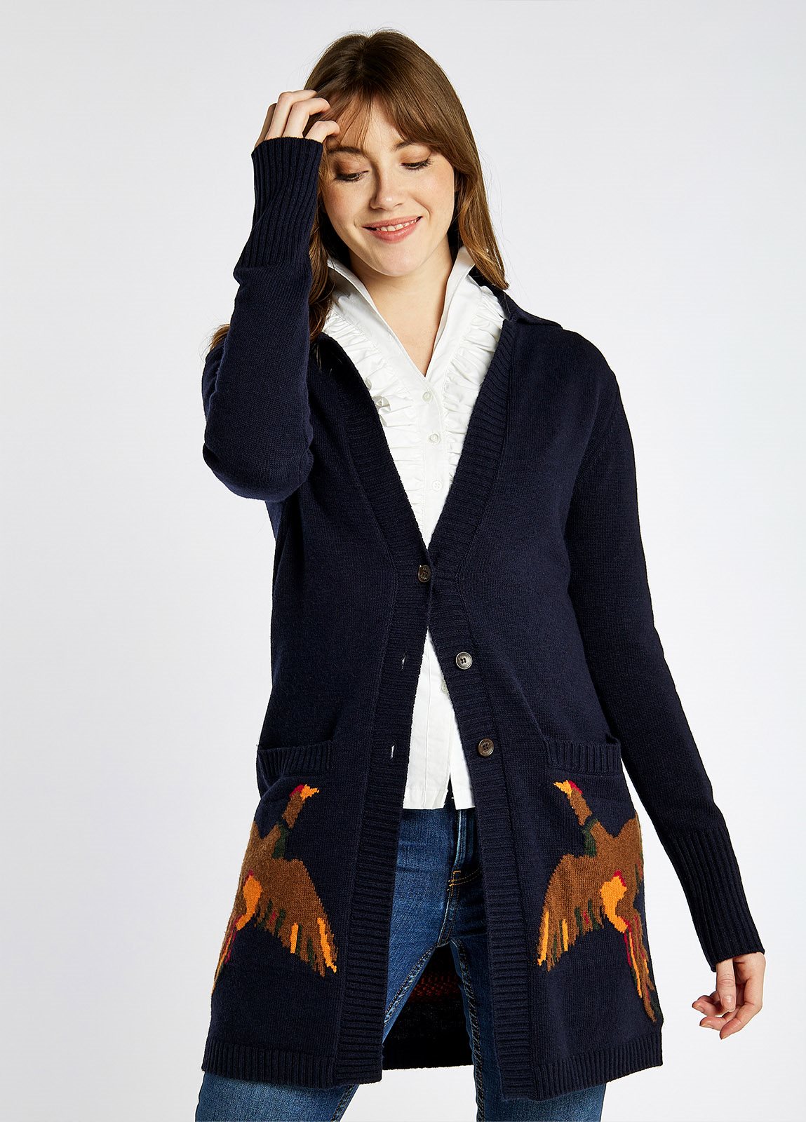 Women’s long knit cardigan with unique pheasant motif.