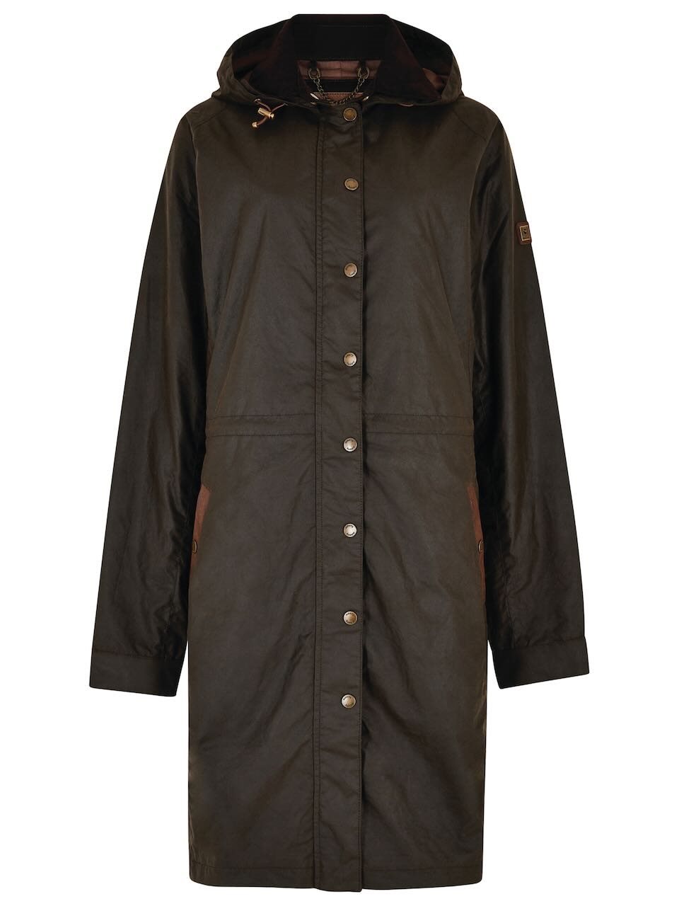 Langere waxjas voor dames van Dubarry model Ballyvaughan. De jas heeft de uitstraling van een parka en heeft een afneembare capuchon en een verstelbaar koord in de taille. De jas heeft twee met leer afgezette steekzakken en een extra binnenzak.
