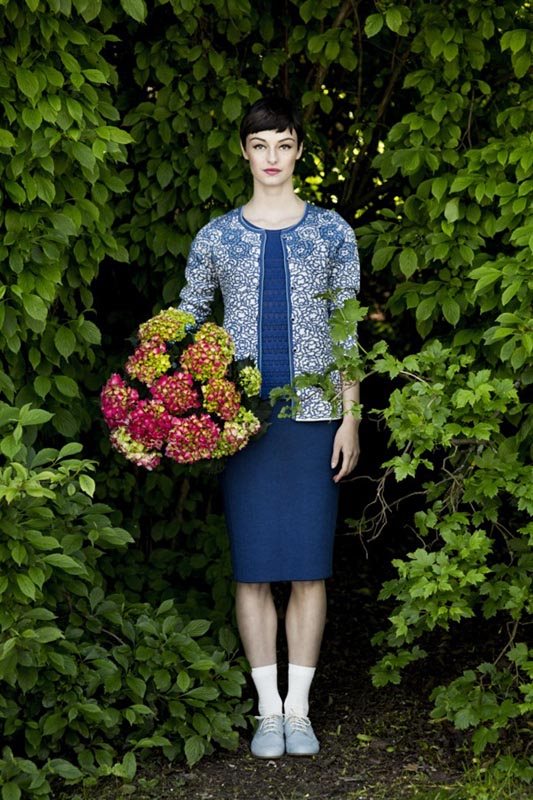 Halflang vest met ronde hals, donkerblauwe decoratie op witte ondergrond